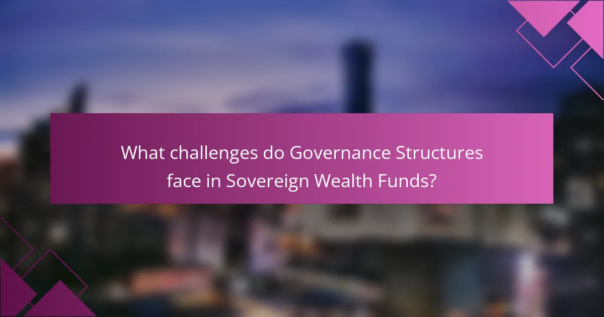 Governance structures in sovereign wealth funds face several challenges. These include political interference, which can undermine decision-making processes. Additionally, lack of transparency can lead to mistrust among stakeholders. Another challenge is the alignment of investment strategies with national interests. Conflicts of interest may arise when personal agendas influence fund management. Moreover, varying regulatory environments can complicate governance practices. Finally, the need for skilled personnel poses a significant hurdle in maintaining effective governance. Each of these challenges impacts the overall effectiveness and integrity of sovereign wealth fund governance.